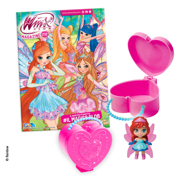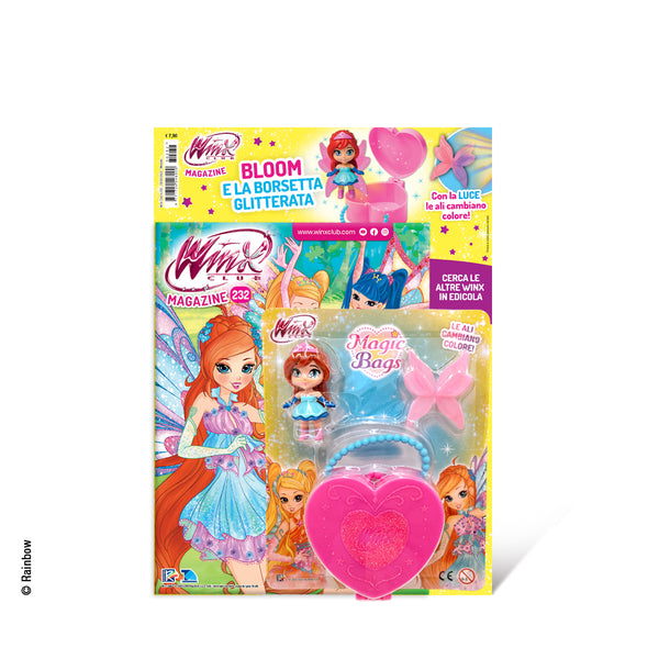 Il magazine ufficiale di Winx Club con il personaggio di Bloom con la magica borsetta glitterata a forma di cuore. Le ali cambiano colore alla luce del sole.